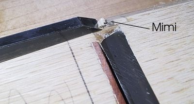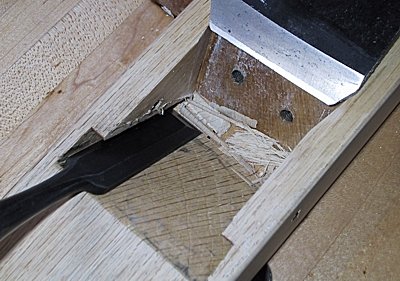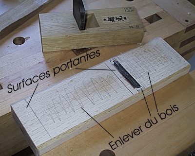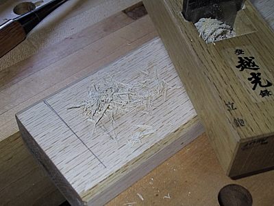 Avec un ciseau bien aiguisé, le chêne japonais se travaille admirablement bien. Attention de ne pas toucher à la partie supérieure des rainures latérales; seuls le siège et le fond des rainures doivent être creusés. On répète cette procédure quatre ou cinq fois jusqu’au moment où le tranchant du fer arrive à 2 mm de la lumière, le fer étant descendu à la main. De cette façon, lorsqu’on le frappera au maillet, il atteindra la lumière. Les rainures doivent présenter un dégagement d’environ 1 mm de chaque côté du fer pour permettre l’ajustement latéral.