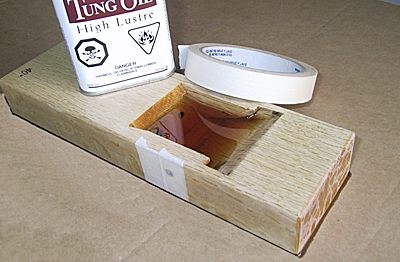 Pour stabiliser le Dai et empêcher que les brusques variations d’humidité ne le déforment constamment, il faut l’imprégner d’huile d’abrasin. On bouche la lumière et les trous de la tige avec du ruban à masquer, puis on remplit la cavité avec l’huile. En moins d’une heure, on voit l’huile suinter à l'avant, puis à l’arrière du Dai (fig. 13). Le chêne japonais est très poreux. Ajouter de l'huile au besoin. Vider et bien essuyer l’huile et recommencer la même procédure le lendemain.