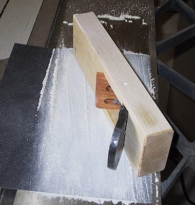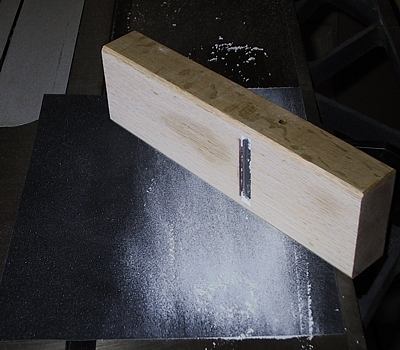 Maintenant, il faut que le Dai ait une géométrie parfaite. Le chêne s’est sûrement déformé depuis qu’il a été façonné par l’artisan en raison des variations de l’humidité ambiante et surtout suite à l’insertion du fer. On aplanit la semelle en la frottant sur du papier abrasif 200 posé sur une surface plane. Ici, le papier est collé avec une colle en aérosol sur le dessus d’une scie de table. Il faut garder le fer et le contrefer dans le Dai, mais légèrement en retrait de la lumière. Une vingtaine de mouvements de va-et-vient avec pression égale aux quatre coins sont suffisants pour donner une semelle bien plane (figure 5).