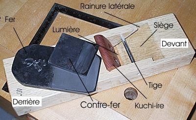 Le fer et le contrefer arrivent toujours bien aplanis, aiguisés et polis. Comme plusieurs outils tranchants japonais, ils sont faits d’un acier mou (Jigane) soudé à un acier à haute teneur en carbone (Hagane) dans lequel est taillé le tranchant. Notez que le fer, vu en coupe longitudinale, a une forme en coin. Il vient s’asseoir sur le siège du Dai en s’insérant dans les rainures latérales. Le fer n’a donc pas besoin d’un coin pour le retenir en place. Le contrefer ne sert pas à retenir le fer non plus. Sa fonction est de briser et relever les planures. La tige sert uniquement à plaquer le contrefer sur le fer.