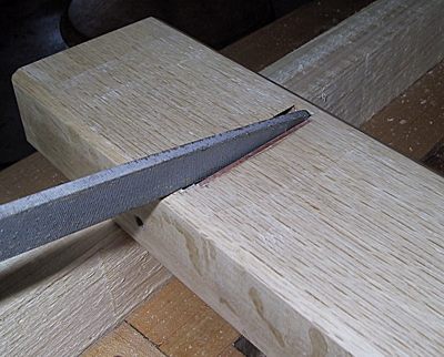 Avec un ciseau bien aiguisé, le chêne japonais se travaille admirablement bien. Attention de ne pas toucher à la partie supérieure des rainures latérales; seuls le siège et le fond des rainures doivent être creusés. On répète cette procédure quatre ou cinq fois jusqu’au moment où le tranchant du fer arrive à 2 mm de la lumière, le fer étant descendu à la main. De cette façon, lorsqu’on le frappera au maillet, il atteindra la lumière. Les rainures doivent présenter un dégagement d’environ 1 mm de chaque côté du fer pour permettre l’ajustement latéral.